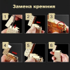 При открытии крышки из клапана сразу начинает поступать газ. При повороте кресала высекаются искры поджигающие газ. Пламя гасится при закрытии крышки.